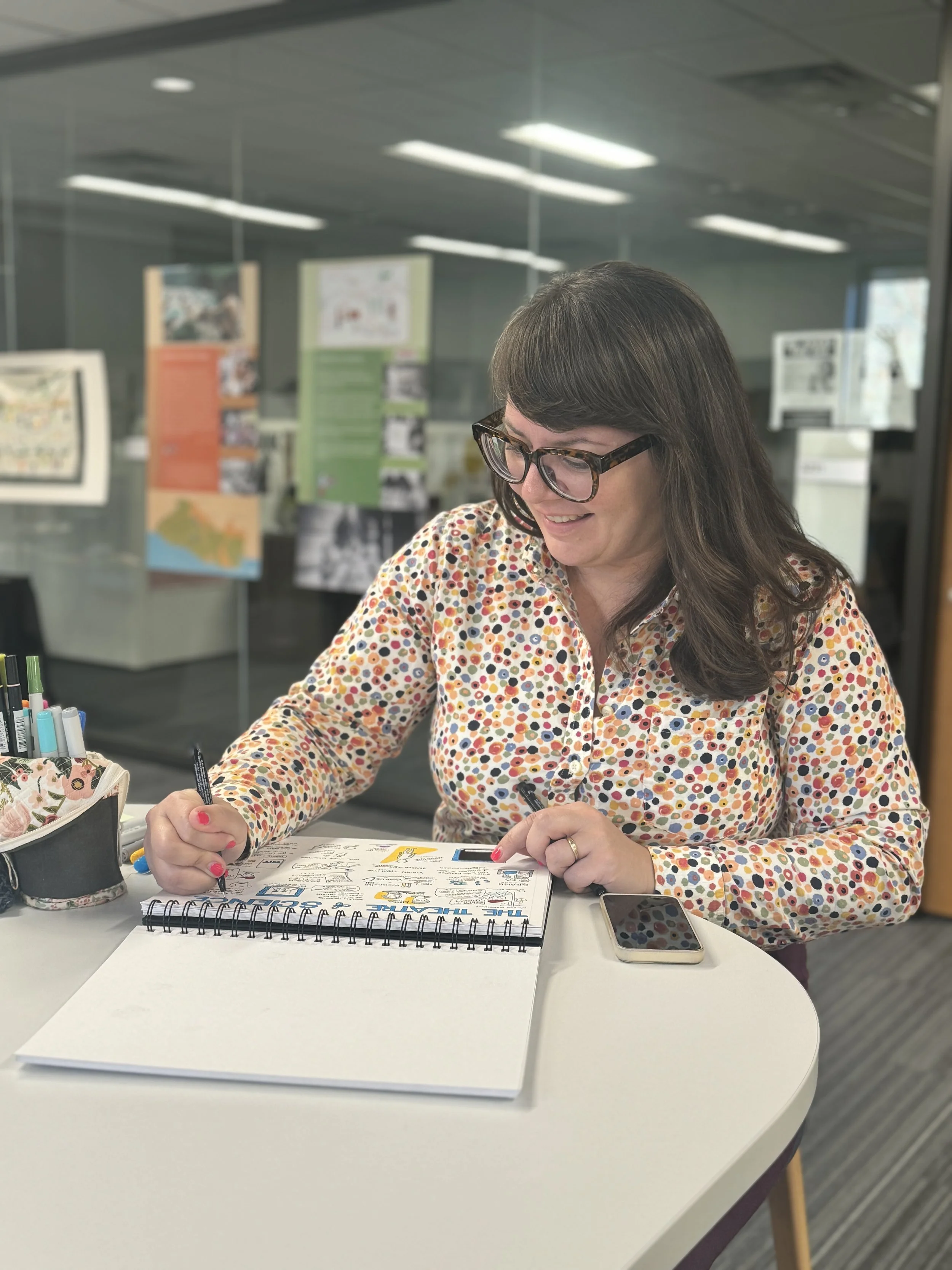 Hi! I’m Danielle Taschereau Mamers, a live illustrator and visual facilitator. I’m the woman behind the sketchbook and the DTM in the studio.